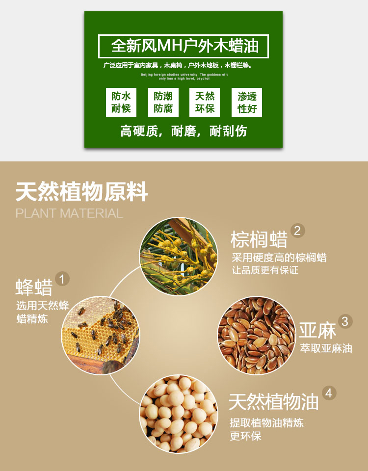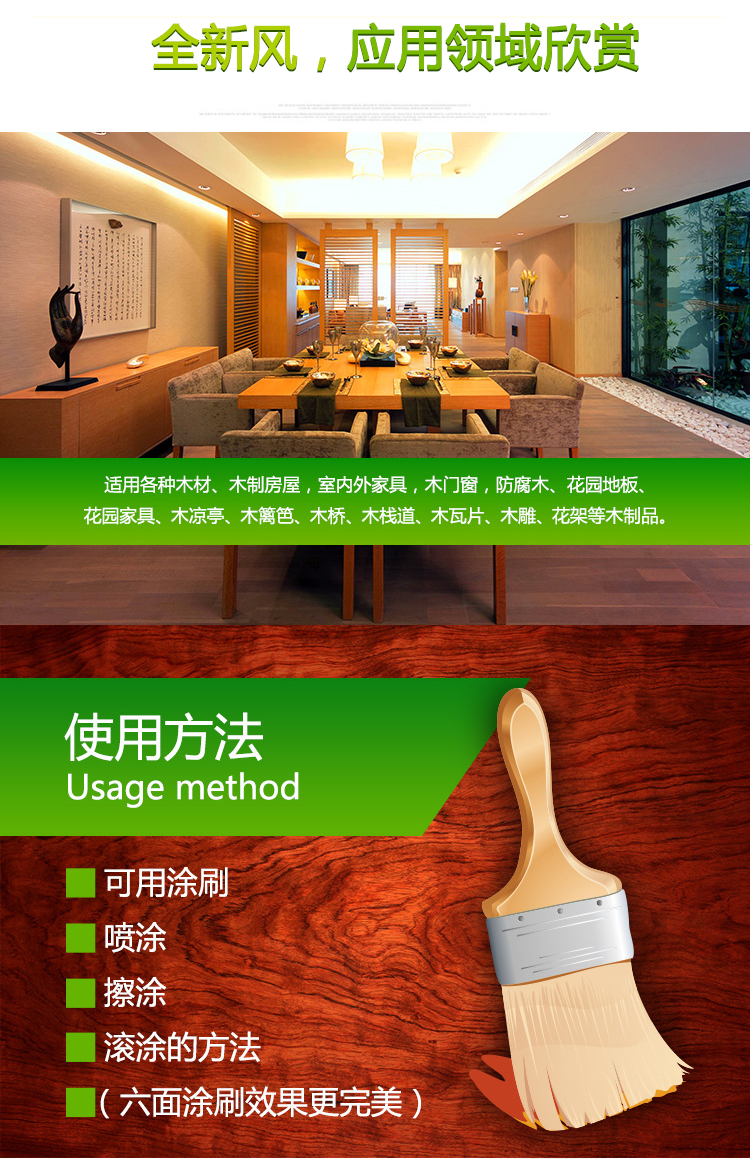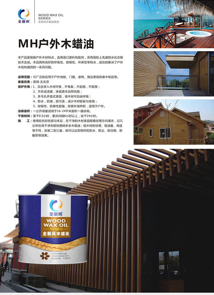 本產(chǎn)品是根據(jù)戶外木材特點(diǎn),選用進(jìn)口原料和助劑,采用國際上先進(jìn)的水化交聯(lián)技術(shù)合成。本品具有良好的呼吸性、耐候性、環(huán)保性等特點(diǎn),成功的解決了戶外木結(jié)構(gòu)遇到的一系列問題。
